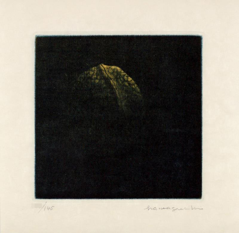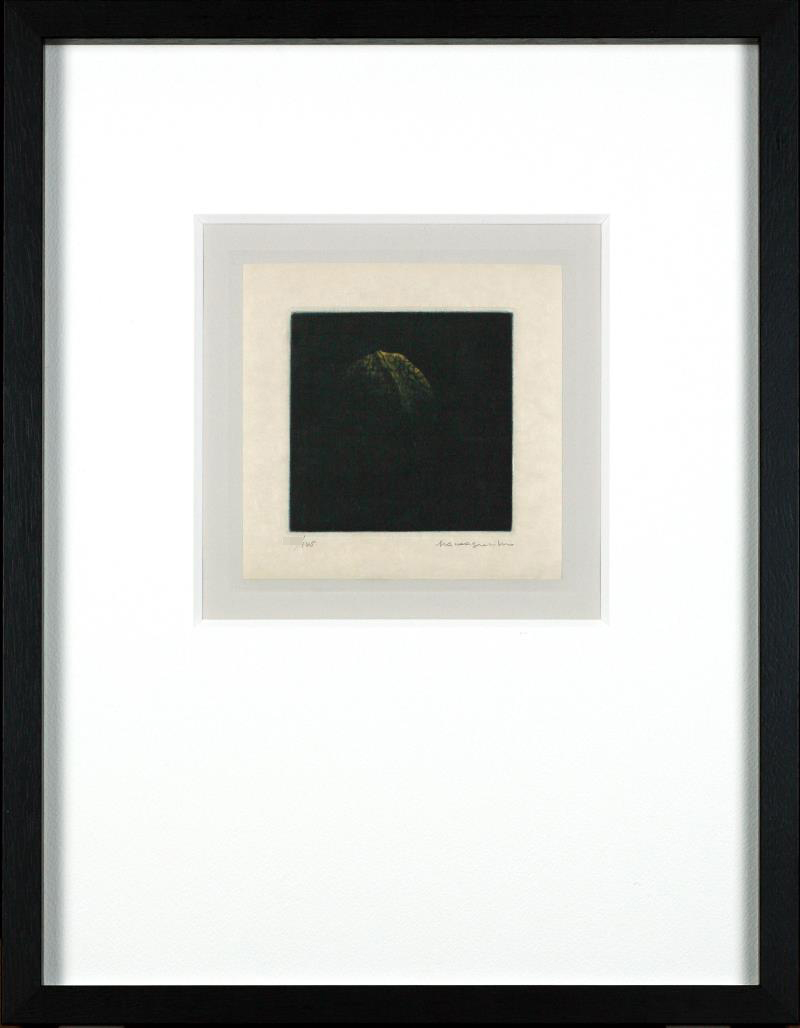 | 画寸:8.6×8.6cm 額寸:40×30/8cm 技法:カラーメゾチント 部数:145部 サイン:右下に作家直筆 深い黒 「黒が濃い」のではありません「黒が深い」のです。 全ての浜口作品に言えることではありますが、彼の作品の黒には向こう側があります。 それを「深淵の闇」と呼んでも差し支えないのではないでしょうか。 ニーチェもいわく、 深淵は究極の暗闇などではなく向こう側にいる者が存在するのです。 闇に浮かぶサクランボや蝶々の彼の作品たち。 赤い色のそれらはきっと目を引くことでしょう。 それに対して、この作品の琥珀色はなんとも静かに。 静かに。静かに。闇の中に浮かび上がってきています。 全てが見えているわけではなく、半分ほどはまだ闇の中。 もし、この作品に目を惹かれたならば私たちの目は何を見ようとしているのでしょうか。 胡桃の見えない部分。 ではないはずです。 その胡桃を隠している闇の中にある何かを感じているのです。 浜口陽三は、同じ胡桃の銅版画(モノクロ)も制作しています。 検索するとどちらも一緒にひっかかるかもしれませんが どちらも本物ですので、お好みで選ばれると良いと思います。 今回の出品は弊社にて新品額装していまして、マットはワーグマンの3mm、アクリルはUV仕様。 他社と比べるまでもなく、ご満足いただける仕上がりと自負しています。 ちなみに私は奥さまの南桂子さんの作品も大好きです。 こちらはポップ(?)でかわいいので、全く毛色が違いますが、ぜひ見てみてください。 |